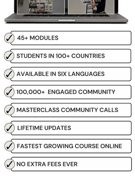 The English version of the program includes 33 modules, covering everything from mindset and digital marketing basics to advanced topics like faceless marketing, funnels, social media, email automation, and more